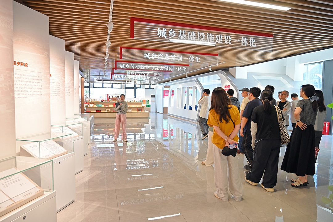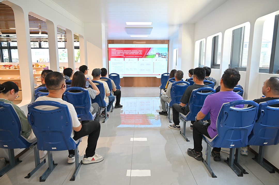 抵達(dá)三星村后,在講解員的帶領(lǐng)下,黨員們實(shí)地參觀了三星村公共服務(wù)中心、三星村家宴中心、101路城鄉(xiāng)公交復(fù)原車及站點(diǎn)、共富桃林、村口“攜手共富”墻等。每到一處,大家都被這些展示城鄉(xiāng)一體化發(fā)展的實(shí)例深深打動(dòng),進(jìn)一步認(rèn)識(shí)到實(shí)現(xiàn)共同富裕的重要性。